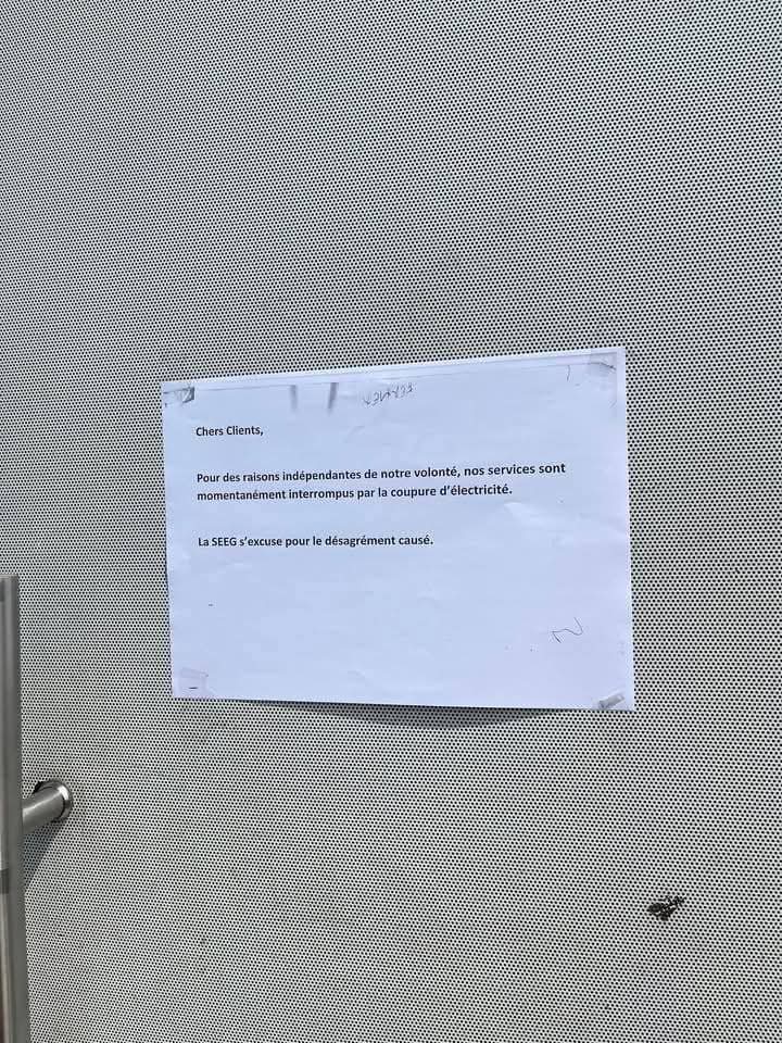 L’inscription sur la porte d’entrée du siège prête à sourire, mais elle illustre aussi une réalité bien connue des habitants : les coupures font partie intégrante du quotidien.« C’est un peu comme si un restaurant manquait de nourriture ou une station-service d’essence », commente avec humour un client venu régler sa facture, qui a finalement rebroussé chemin, faute d’électricité… chez le fournisseur d’électricité lui-même.La SEEG, qui conserve son sens de l’humour (du moins, espérons-le), a diffusé un bref message expliquant qu’une « panne technique sur le réseau local » est à l’origine de l’incident.