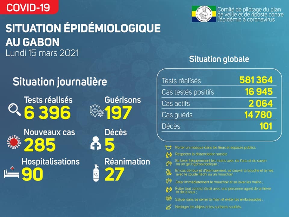 Estuaire : 203 nouveaux cas positifs sur 5 981 prélèvements à Libreville, soit un total de 12 598 cas confirmés ; Le Haut Ogooué : 74 nouveaux cas positifs sur 220 prélèvements dont 67 à Franceville et 07 à Moanda, soit un total de 1 850 cas confirmés ; le Moyen Ogooué : 01 nouveau cas positif sur 87 prélèvements à Lambaréné, soit un total de 548 cas confirmés ; l’Ogooué Lolo : 05 nouveaux cas positifs sur 59 prélèvements à Koulamoutou, soit un total de 180 cas confirmés ; l’Ogooué Maritime : 02 nouveaux cas positifs sur 49 prélèvements à Port-Gentil, soit un total de 1 308 cas confirmés. Au total, sur 581 364 tests réalisés, nous avons enregistré 16 945 cas positifs dont 2 064 cas actifs, 14 780 guérisons et 101 décès.