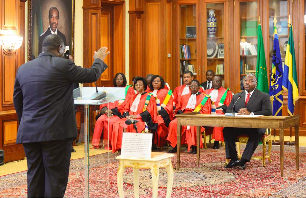 Le Président de la République, Ali Bongo Ondimba, a reçu ce lundi le serment du Premier ministre, chef du gouvernement, M. Emmanuel Issoze Ngondet et des 40 membres du nouveau gouvernement. C’est en présence des membres de la Cour constitutionnelle, dont sa présidente Mme Marie Madeleine Mborantsouo, que s’est déroulée cette audience solennelle conformément à l’article 15 de la Constitution gabonaise. « Je jure de respecter la Constitution et l’Etat de droit, de remplir consciencieusement les devoirs de ma charge dans le strict respect de ses obligations de loyauté à l’égard du chef de l’Etat, de garder religieusement, même après la cessation de mes fonctions, la confidentialité des dossiers et des informations classés secret d’Etat et dont j’aurai eus connaissance dans l’exercice de celles-ci. Je le jure. » a déclaré la nouvelle équipe gouvernementale. Au terme de cette cérémonie de prestation de serment, le chef de l’Etat a renvoyé les 41 membres de ce gouvernement d’actions à l’exercice de leurs fonctions. Nommé par décret le 4 mai dernier, cette nouvelle équipe a vu l’entrée de trois nouveaux ministres de l’opposition conformément aux décisions prises lors du dialogue politique. Il prend également en compte le quota de 33% de femmes fixé par le chef de l’Etat]]>