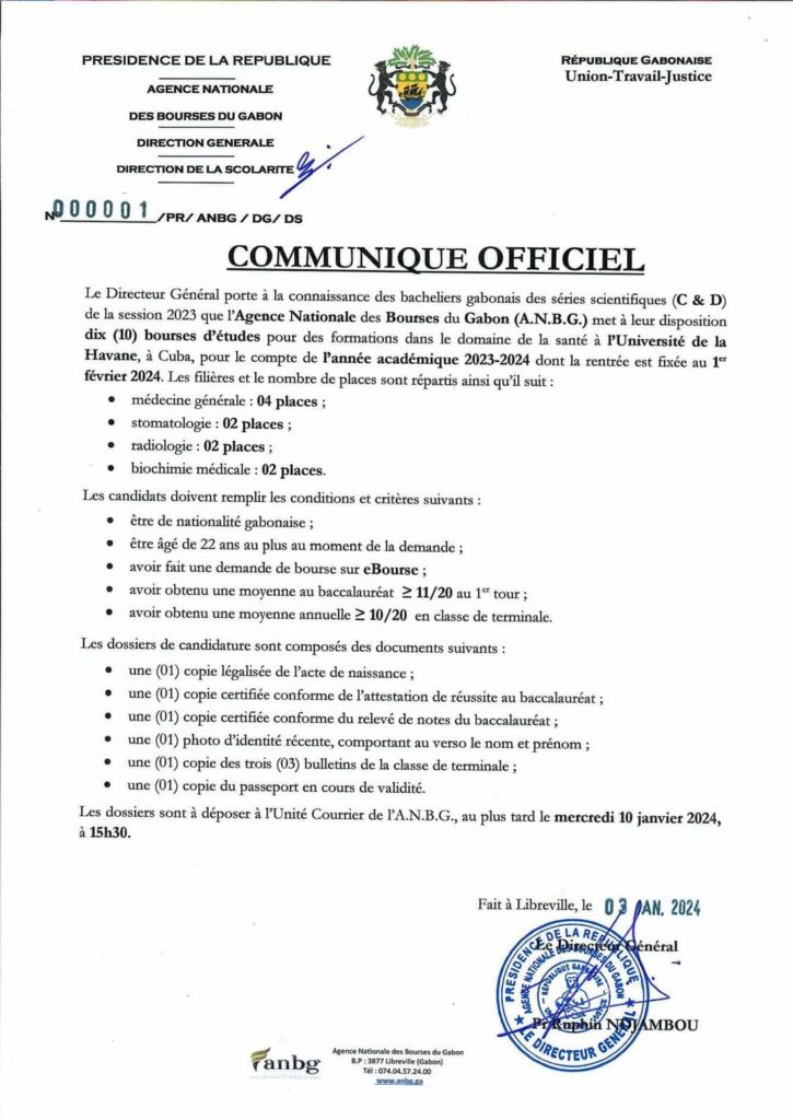 Il s’agit notamment des bacheliers gabonais des séries scientifiques (C & D) de la session 2023, à qui s’adresse cette offre. – La date limite de dépôt des dossiers de candidature est fixée au mercredi 10 janvier 2024, à 15h30.