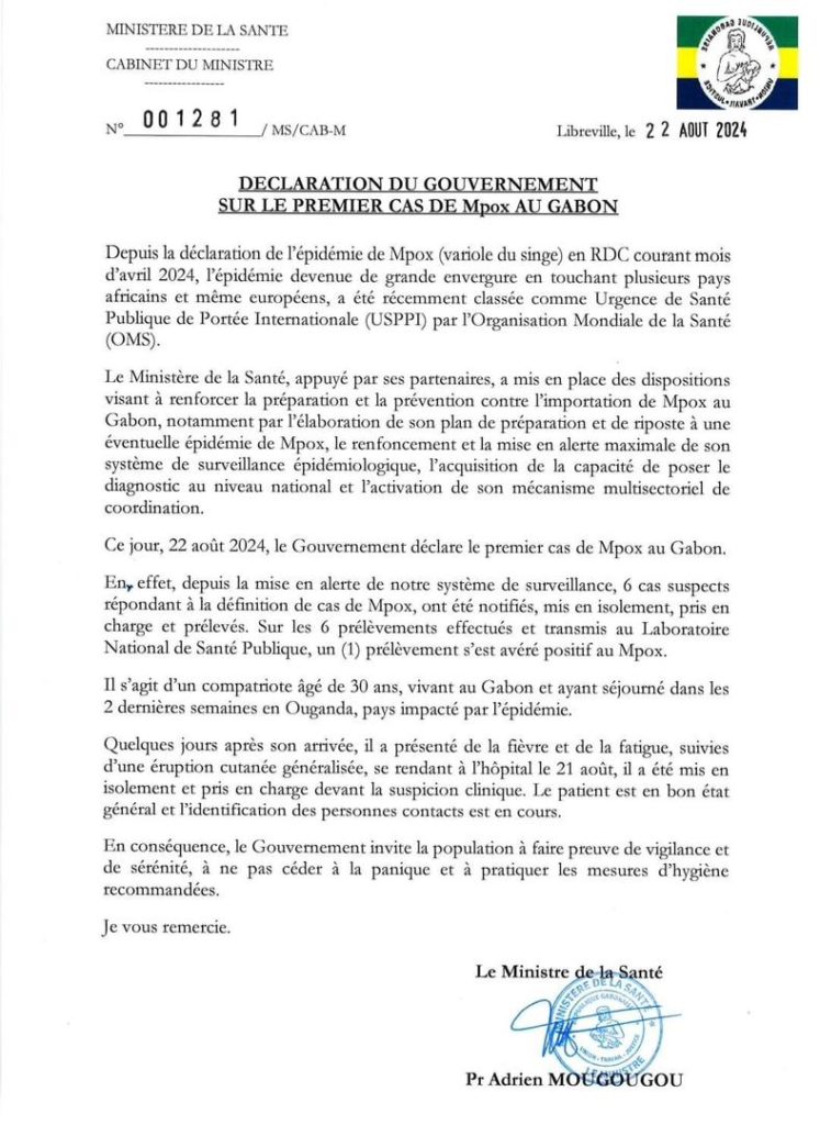 SANTÉ Communiqué du Ministère de la Santé : le Gabon déclare son premier cas de «variole de singe» sur son territoire par Focus Groupe media 23 août 2024 23 août 2024 1,1K Le Gabon a désormais son premier cas de variole de singe, c’est en tout cas ce qui ressort du communiqué du ministère de la santé : PartagerCommentaires CasGabonSantéVariole 0 commentaires Email Focus Groupe media article précédent Tribune libre : APRÈS INVESTIGATION, DE LA NÉCESSITÉ DE CLARIFIER CERTAINS ASPECTS SUR LA DÉTENTION ET LA LIBÉRATION POLÉMIQUE de Landry WASHINGTON article suivant Coupures abusives d’électricité : Oligui promet de faire le ménage à la SEEG Articles similaires Travaux du Centre Médical d’Akébé : Un pas... 13 décembre 2025 Franceville : les travaux du Futur CHU avancent... 12 décembre 2025 Gabon / Santé : Inauguration du pavillon d’imagerie... 11 décembre 2025 Gabon : le SAMU social distribue 10,4 milliards... 10 décembre 2025 FIN DE MISSION À LA PRÉSIDENCE : LE... 5 décembre 2025 Le SAMU Social Gabonais : Un havre de... 4 décembre 2025 Inspection sanitaire d’une boulangerie artisanale à Nzeng-Ayong :... 4 décembre 2025 Libreville : le SAMU Social lance une caravane... 3 décembre 2025 Sida au Gabon : la Ministre alerte sur... 3 décembre 2025 Gabon: le Dr Wenceslas Yaba s’excuse suite à... 2 décembre 2025