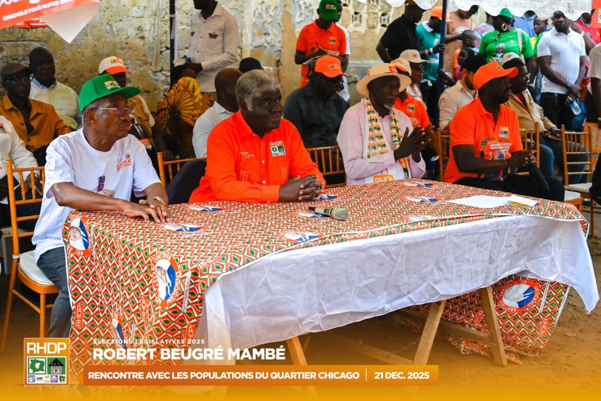 « Nous voulons porter des lois utiles, proches de vos réalités quotidiennes », a martelé la coordination lors de la rencontre au quartier Chicago.À quelques jours du scrutin, la Coordination RHDP Songon a tenu à remercier les populations pour leur engagement et leur accueil chaleureux. L’appel à la mobilisation générale a été lancé pour le samedi 27 décembre.Le mot d’ordre reste le même : le « 1 Coup Gbô » (une victoire dès le premier tour). Le RHDP espère ainsi confirmer sa domination dans cette zone clé et assurer une majorité confortable au Président de la République pour la poursuite de son programme de développement.