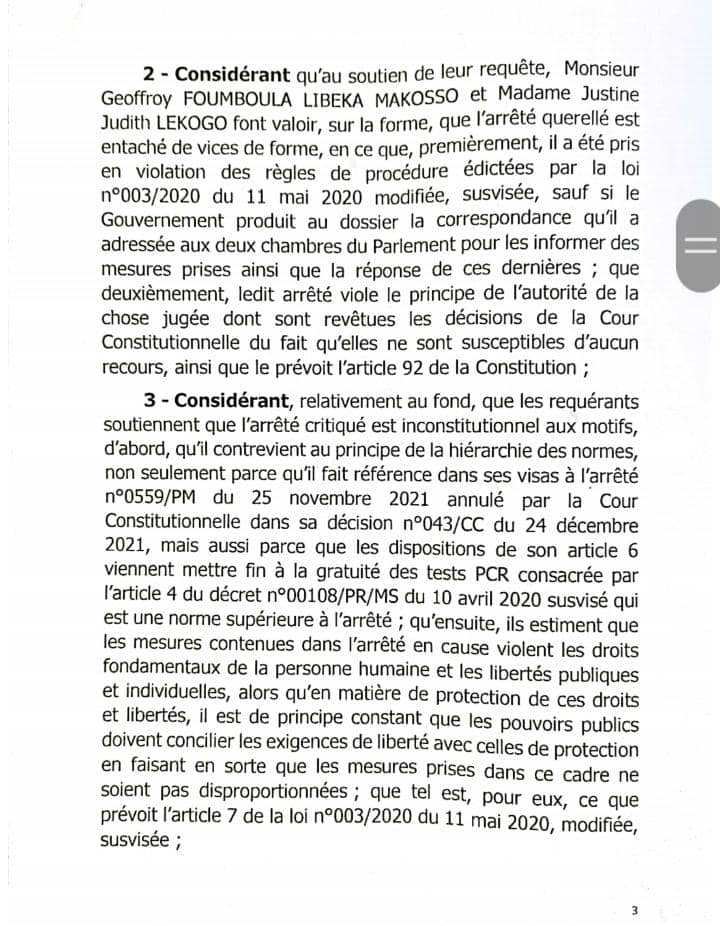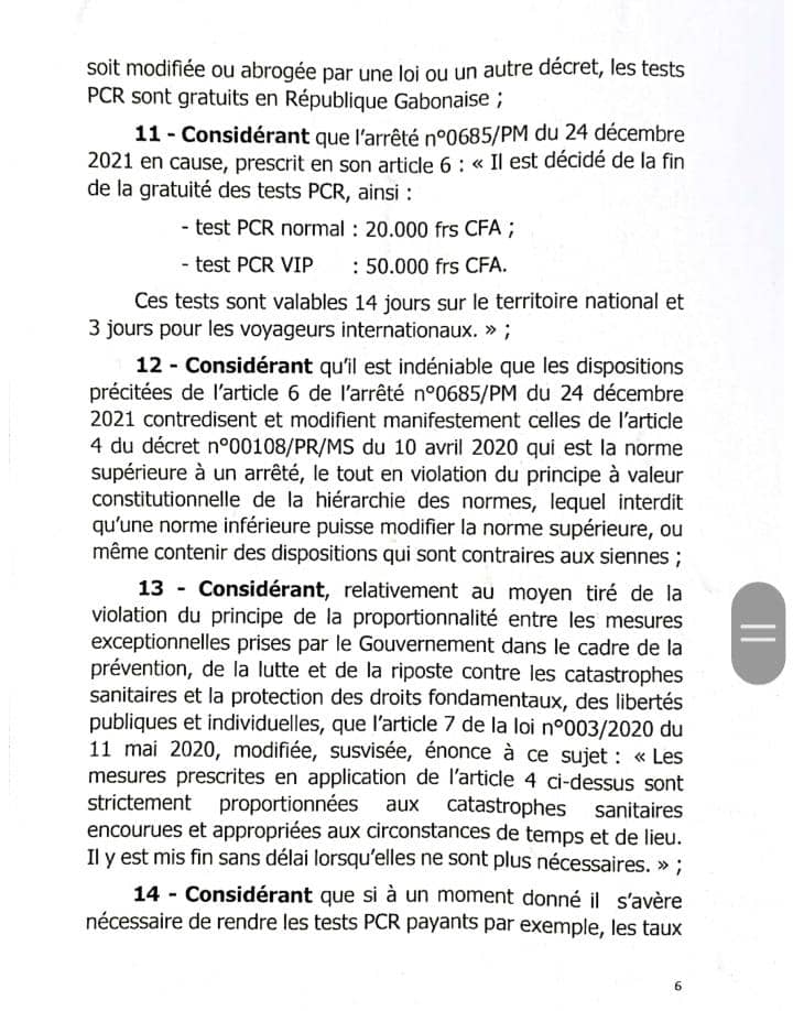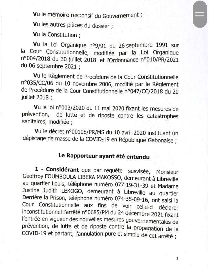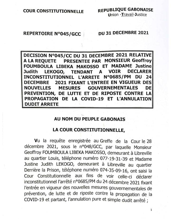 L’arrêté 685/PM qui fixait les nouvelles mesures gouvernementales de prévention, de riposte de lutte contre la propagation de la pandémie à Covid-19, vient d’être annulé par la cour constitutionnelle gabonaise, présidée par Marie Madeleine Mborantsuo, qui vient de rendre sa décision, suite à la saisine du Copil citoyen, à la fin du mois de décembre 2021.