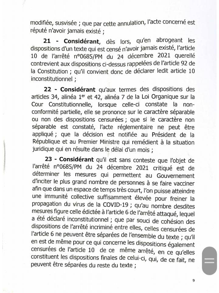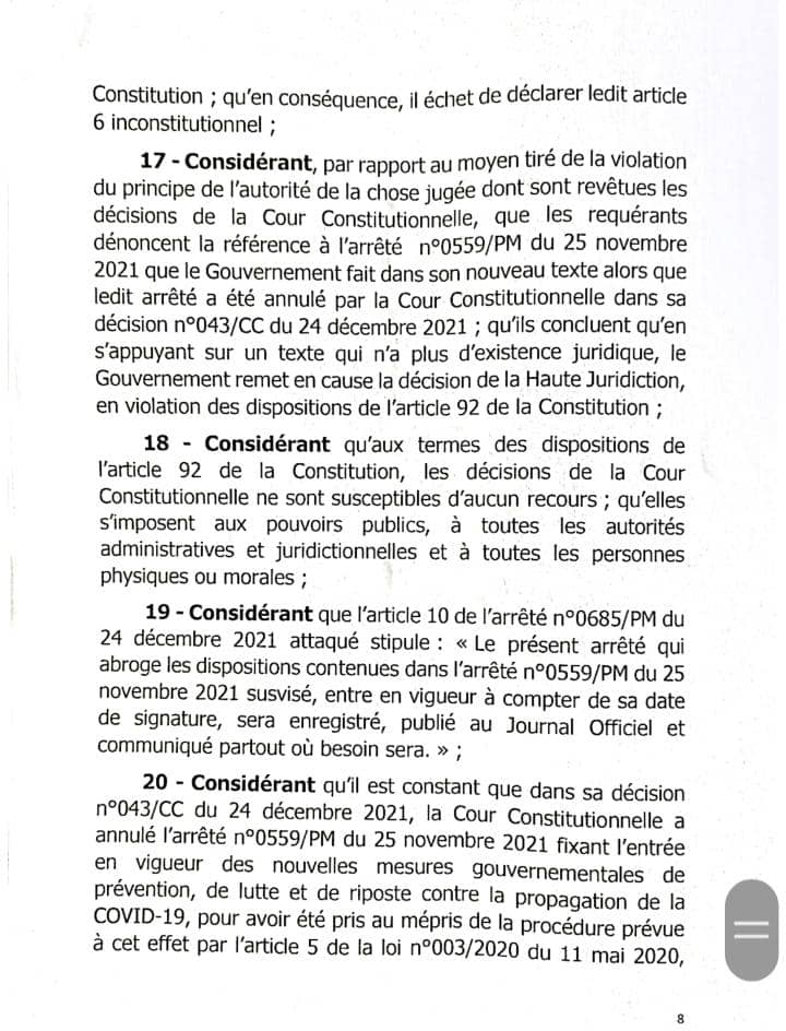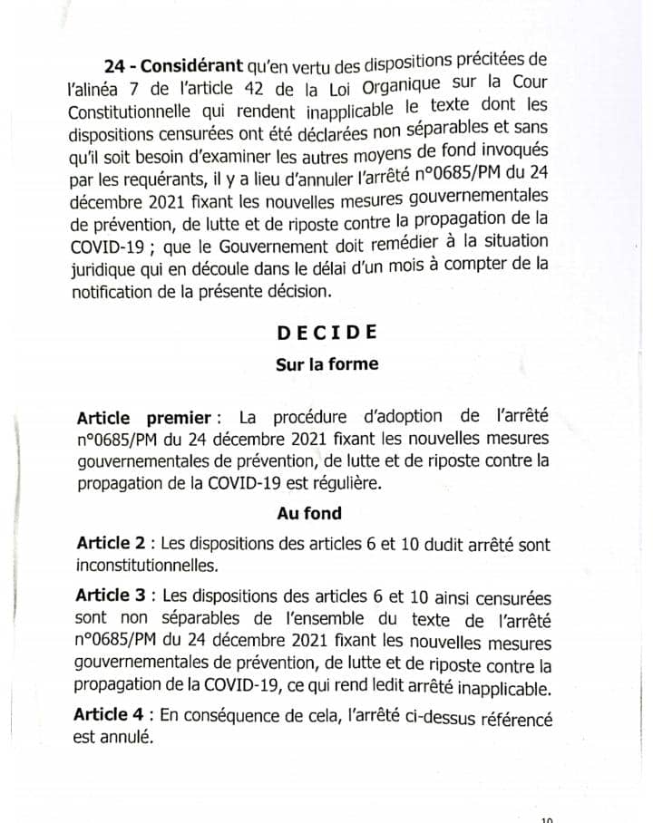 Dans sa décision, la plus haute juridiction du pays a déclaré l’arrêté N°0685/PM inconstitutionnel, et donc annulé sur le fond et sur la forme. Par conséquent, les mesures antérieures à cette procédure, restent en vigueur.