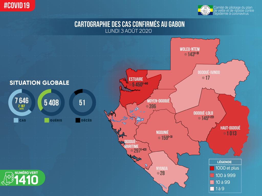 Au total, sur 81 366 prélèvements réalisés depuis le déclenchement de la pandémie au Gabon le 12 mars, le pays a enregistré 7 646 cas testés positifs (9,4%) dont 5 408 guéris (70,7%) et 51 décès ; 27 personnes hospitalisées dont 4 en réanimation.
