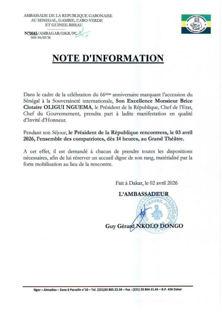 Au-delà du protocole officiel, ce séjour revêt une dimension humaine et patriotique majeure. Comme le précise une note d’information de l’Ambassade du Gabon au Sénégal datée du 2 avril 2026, le Chef de l’État a tenu à inscrire dans son agenda une rencontre directe avec la diaspora. Ce rendez-vous très attendu se tiendra le 03 avril 2026, dès 14 heures, au Grand Théâtre de Dakar. Pour les milliers de Gabonais résidant au Sénégal — étudiants, entrepreneurs ou fonctionnaires internationaux — ce sera l’occasion d’échanger sur la marche de la Transition et les réformes en cours au pays.L’Ambassadeur Guy Gérard Nkolo Dongo a d’ores et déjà lancé un appel à une « forte mobilisation » pour réserver un accueil digne de son rang au Président de la République. Ce type de rassemblement, devenu une tradition lors des déplacements présidentiels, permet de cimenter l’unité nationale hors des frontières et de rassurer les compatriotes de l’extérieur sur leur rôle crucial dans l’édification du Gabon de demain.