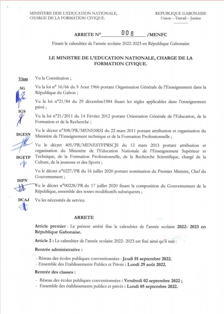 EDUCATION Éducation : reprise des cours le 05 Septembre 2022 pour les secteurs public et privé par Focus Groupe media 20 juillet 2022 20 juillet 2022 705 Communiqué du Ministre de l’Éducation Nationale : PartagerCommentaires Camelia Ntoutoume-LeclerqGabonLe 05 septembreReprise des cours 0 commentaires Email Focus Groupe media article précédent CPPF: Vers une réforme pour éviter les difficultés de fonctionnement similaires à celles de la CNSS article suivant La Fondation Sylvia Bongo ONDIMBA n’a reçu que deux dons estimé »chacun à 5 millions de la part de la GOC » en 2016 et 2018 pour Octobre Rose qui existe »depuis 2013″ Articles similaires Lycée Joseph Ambouroué Avaro de Port-Gentil: où sont... 12 décembre 2025 Mimongo : Colère des Lycéens face au manque... 6 décembre 2025 Le Lycée de l’Excellence de Franceville : une... 6 décembre 2025 Libreville : le SAMU Social lance une caravane... 3 décembre 2025 Education/ Gabon: quand l’absence de Budget de fonctionnement... 2 décembre 2025 Grève au Complexe Jean Hilaire AUBAME EYEGHE :... 2 décembre 2025 Visite d’inspection conjointe dans les établissements privés d’Akanda... 29 novembre 2025 Réunion Stratégique à l’Estuaire : le SOSUP accélère... 21 novembre 2025 Un Partenariat Stratégique Majeur : le CNOU et... 20 novembre 2025 Éducation/ Gabon: l’émargement « à blanc » du registre des... 19 novembre 2025