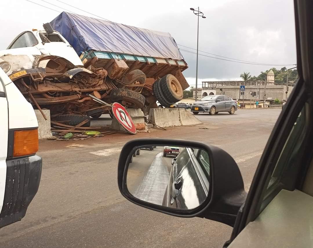 Depuis le week-end dernier, un camion accidenté se trouve sur les talus encore appelés garde-fous au niveau des feux tricolores du carrefour Chaud-Chaud au Pk8, quartier périphérique de Libreville. Au moment où nous écrivons cette brève, le camion s’y trouve encore. À qui incombe-t-il d’enlever ce mastodonte à cet endroit ? Notons que cet axe très fréquenté fait souvent face à des difficultés pour circuler. Et, quid des destructions de biens publics, de panneaux de signalisation et autres ?
