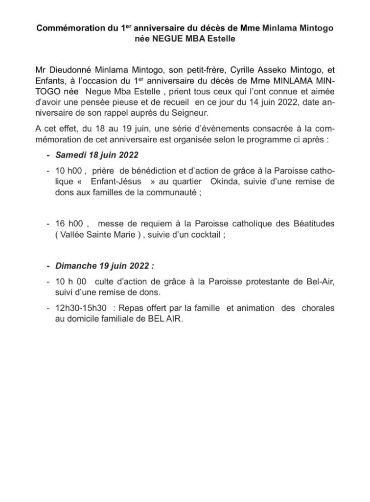 SOCIÉTÉ Évènements consacrés à la commémoration du 1er anniversaire du décès de Mme Minlama Mintogo née Negue Mba Estelle par Focus Groupe media 14 juin 2022 14 juin 2022 1,1K PartagerCommentaires 1an anniversairecommémorationGabonMinlama Mintogo 0 commentaires Email Focus Groupe media article précédent Le bouc-émissaire Denis Bouanga : 5ans, encore loin d’être le leader de l’attaque des panthères ? article suivant Pénurie partielle de Carburant: La SGEPP rassure quant à un retour à la normale! Articles similaires Signature historique pour le Projet « Taxi Vert » :... 15 décembre 2025 Le Président Oligui Nguema inspecte les chantiers stratégiques... 15 décembre 2025 Solidarité nationale : le Président de la République... 12 décembre 2025 Taxe forfaitaire d’habitation au Gabon: les parlementaires invités... 12 décembre 2025 Gabon: Conflit de Compétences persistant entre le Ministère... 12 décembre 2025 Reprise du paiement de plusieurs prestations sociales: Oligui... 11 décembre 2025 Oligui Nguema: «C’est avec une profonde douleur que... 10 décembre 2025 Rétablissement des Prestations Sociales au Gabon : une... 10 décembre 2025 Stage « Expérimenté » : le paradoxe salarié qui s’ancre... 10 décembre 2025 Gabon : le SAMU social distribue 10,4 milliards... 10 décembre 2025