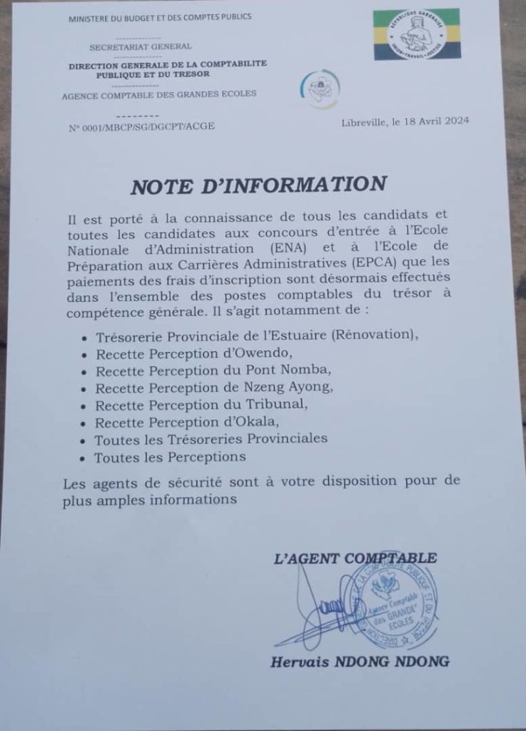 Tout en minimisant certainement le risque du nombre de personnes qui allaient arriver, et croyant avoir les choses en main, le comité d’organisation s’est vu rapidement être débordé par l’affluence et un désordre s’est par la suite installé au sein de l’établissement. Mais la décision vient d’être prise ce 18 Avril 2024 par l’agent comptable Hervais NDONG NDONG.En effet, ce dernier porte à la connaissance de tous les candidats aux concours de l’ENA et à l’école de préparation aux carrières administratives ( EPCA) , que les paiements des frais d’inscription sont désormais effectués dans l’ensemble des postes comptables du trésor à compétence générale. Il s’agit de: