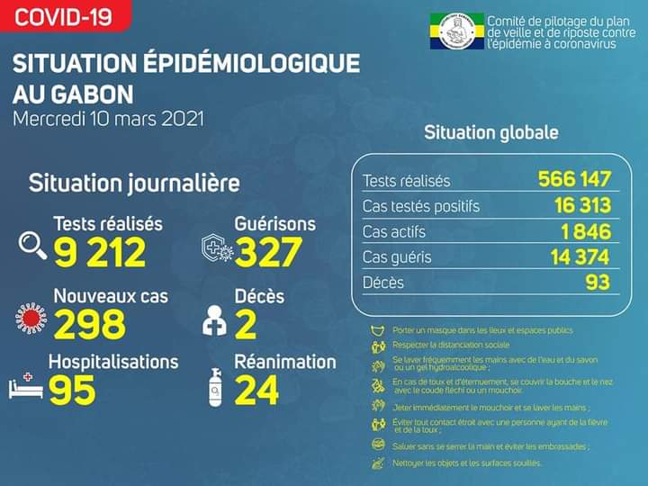 Selon le point officiel de ce mercredi 10 mars 2021 par le Comité de pilotage du plan de veille et de Riposte contre l’épidémie à Coronavirus au Gabon (Copil-Coronavirus), le pays enregistre 02 nouveaux décès sur le territoire lié à la seconde vague de la Covid-19.