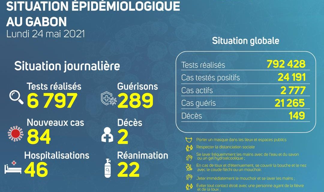 Selon le comité de pilotage de lutte contre la Covid-19 (COPIL), le Gabon a enregistré 84 nouveaux cas positifs sur 6 797 tests réalisés, soit un taux de positivité de 1.2%, 46 personnes hospitalisées dont 22 en réanimation pour détresse respiratoire, 289 nouvelles guérisons et 02 nouveaux décès à Libreville (1) et Oyem (1).