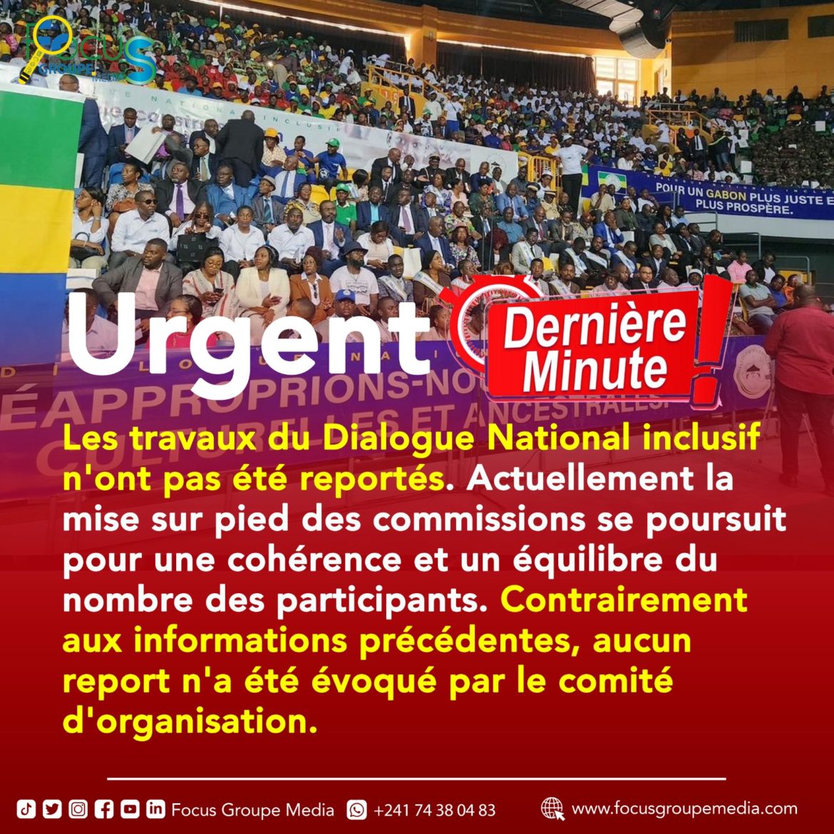 Depuis quelques heures plusieurs médias à l’instar de Gabon Media Time, TV+ Afrique, Dépêches 241 et certaines pages Facebook relaient fortement l’information selon laquelle les travaux du dialogue national inclusif censés débuter ce jour auraient été reportés auraient été reportés au lundi 8 avril prochain. Une information qui s’avère être au finale fausse.En effet, selon l’un des membres du comité d’organisation que la rédaction de Focus Groupe Media a pu joindre au téléphone rassure que les travaux n’ont pas été reportés.
