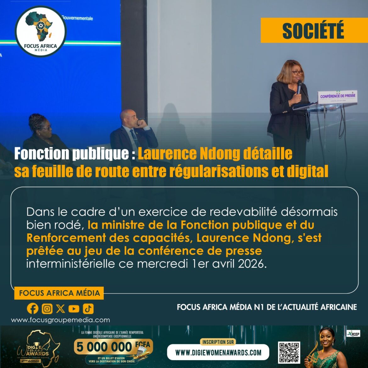 Dans le cadre d’un exercice de redevabilité désormais bien rodé, la ministre de la Fonction publique et du Renforcement des capacités, Laurence Ndong, s’est prêtée au jeu de la conférence de presse interministérielle ce mercredi 1er avril 2026. Devant un parterre de journalistes nationaux et internationaux, la membre du gouvernement a passé en revue les chantiers herculéens engagés pour restaurer la dignité de l’agent public et moderniser l’appareil administratif. Au menu de son intervention : un bilan chiffré des régularisations, les enjeux des élections professionnelles à venir et l’indispensable saut technologique de l’administration gabonaise.