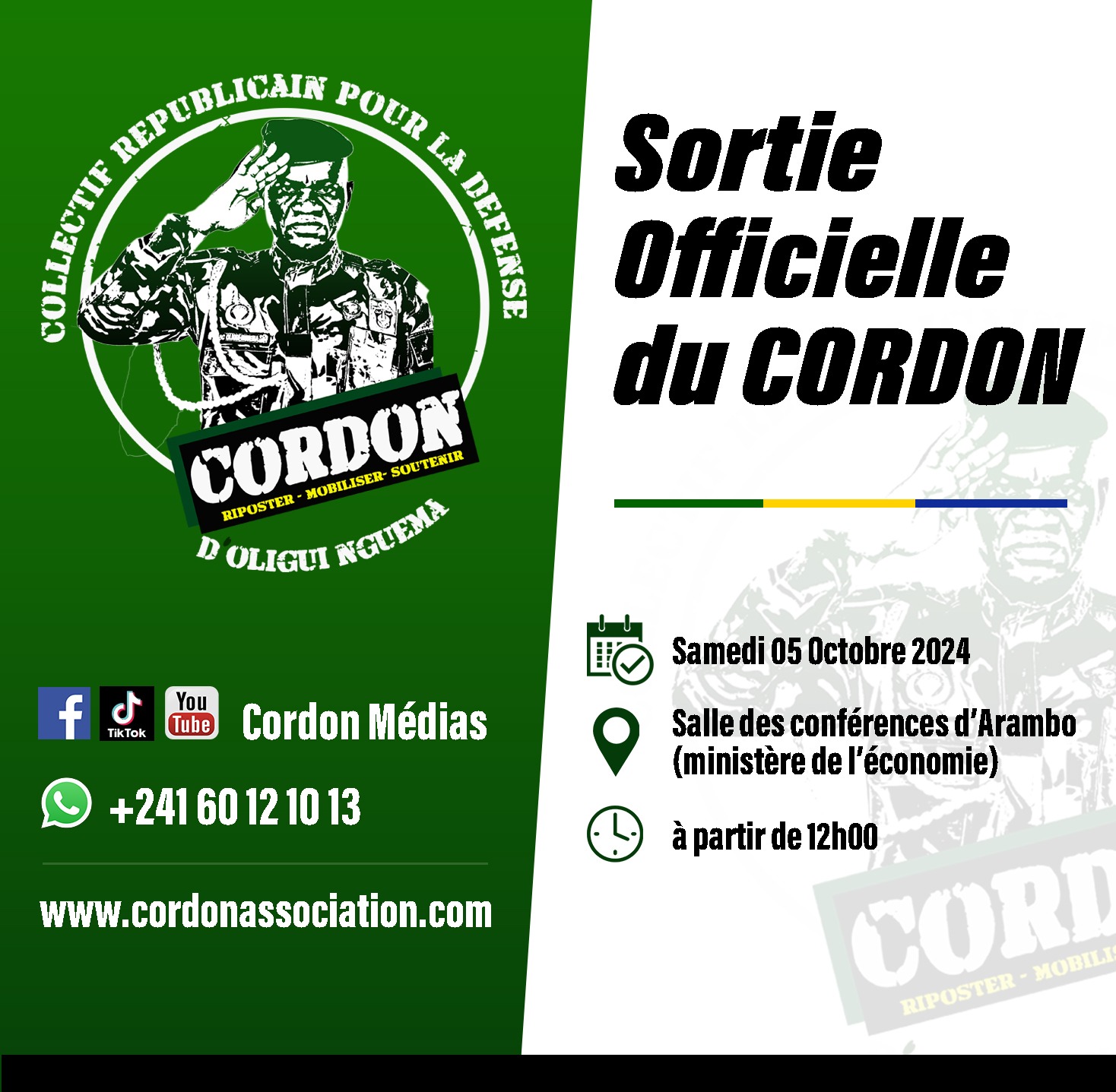 Dans cette optique, la manifestation d’une nouvelle forme de soutien vis-à-vis des actions posées par le Président de la République Chef de l’Etat, le Général de Brigade Brice Clotaire OLIGUI NGUEMA et le CTRI va connaître une réelle concrétisation. L’association LE CORDON entend déployer ses activités le samedi 5 octobre prochain. Le collectif Républicain pour la Défense d’Oligui Nguema va notamment faire sa sortie officielle au cours du weekend prochain à Libreville. Selon le site officiel de l’association, le CORDON est la somme des initiales du Collectif Républicain pour la Défense d’OLIGUI NGUEMA. Il s’agit notamment d’une «Association Nationale de droit privée, créée conformément à la loi 35/62 qui fixe le régime des Association en République Gabonaise. Son siège est fixé à Libreville. Sa durée est illimitée. Sa devise est Riposter – Mobiliser – Soutenir».