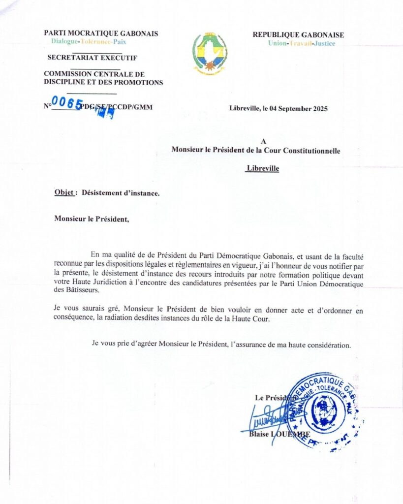 Dans un rebondissement majeur de l’actualité politique gabonaise, le Parti Démocratique Gabonais (PDG) a officiellement retiré tous les recours contentieux qu’il avait déposés devant la Cour Constitutionnelle à l’encontre des candidats de l’Union Démocratique des Bâtisseurs (UDB). Ce désistement, formalisé par une lettre datée du 4 septembre 2025, est perçu par de nombreux observateurs comme un signal fort de décrispation et un pas vers le dialogue politique dans l’après-scrutin.La correspondance, signée par Blaise LOUEMBE, le président par intérim du PDG, a été adressée au Président de la Cour Constitutionnelle.