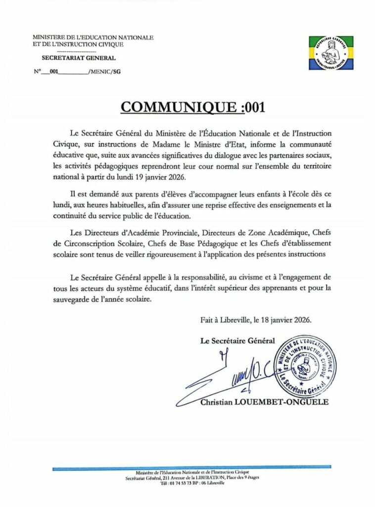 Un dénouement attendu vient de marquer le secteur de l’éducation nationale. Par le biais du communiqué n°001, le Secrétaire Général du Ministère de l’Éducation Nationale et de l’Instruction Civique, Christian Louembet-Onguele, a officiellement annoncé le retour des élèves sur les bancs de l’école. Cette décision, prise sous les instructions de Madame le Ministre d’État, fait suite à des avancées majeures dans les négociations avec les partenaires sociaux, mettant ainsi fin à une période d’incertitude pour le système éducatif gabonais.Dès ce lundi 19 janvier 2026, l’ensemble des activités pédagogiques reprendra son cours normal sur toute l’étendue du territoire national.