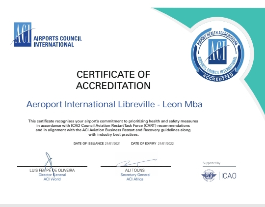 Après avoir reçu l’accréditation sanitaire (Airport Healt Accreditation) du conseil international des aéroports (ACI), l’aéroport international Léon Mba de Libreville devient ainsi le premier d’Afrique Centrale à être certifié.