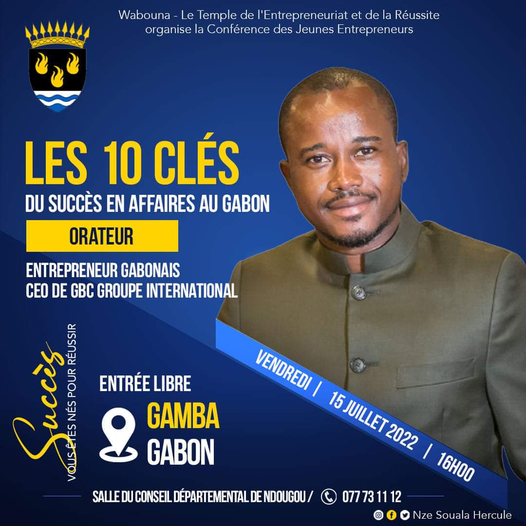 À Gamba, au cours d’une conférence gratuite et Accessible à tous et à toutes, NZE SOUALA Hercule aura l’occasion d’expliquer aux jeunes entrepreneurs de cette localité de la province de l’Ogooué-Maritime, les dix (10) clés du succès en affaires au Gabon. Le rendez-vous est donc donné ce vendredi 15 Juillet à la salle polyvalente du conseil départemental de Ngoudou à partir de 16h00.