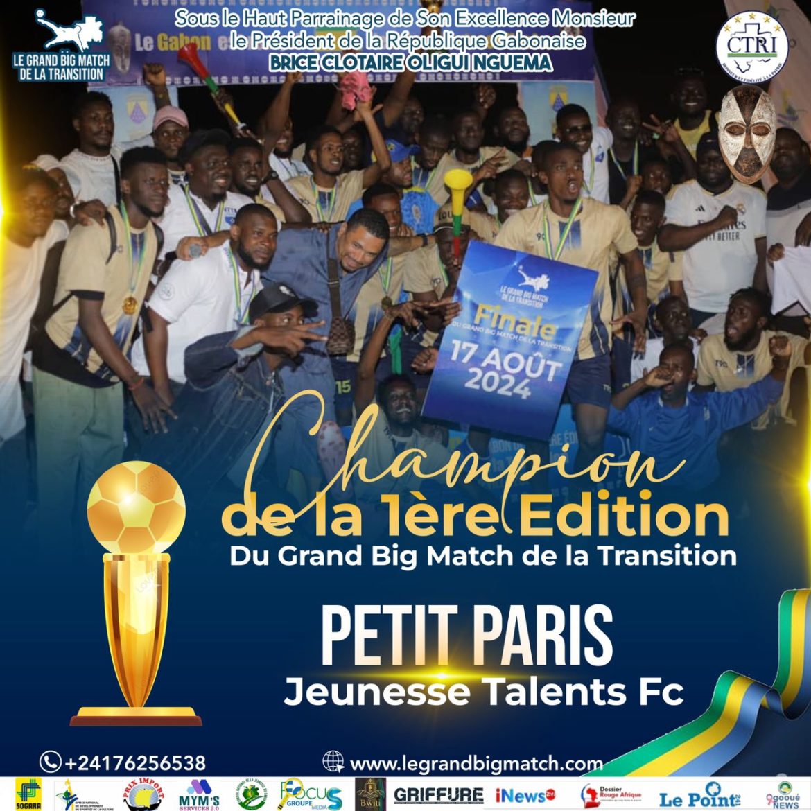 Débuté le 29 Juin dernier, le Big Match de la Transition a rendu son verdict ce samedi 17 août à l’occasion de la finale qui s’est tenu en lumières et grande pompe entre les équipes de Carrefour Léon Mba et Petit Paris. Après plus de un mois de compétition, le Grand Big Match de la Transition a livré son verdict. Au terme du temps réglementaire, 3-3, c’est finalement l’équipe de Petit Paris qui a réussi à s’emparer du trophée de vainqueur de cette première édition aux tirs au but. Si plusieurs informations tendancieuses ont tenté de ternir l’image de la clôture de cette compétition exceptionnelle initiée par Nze Souala Hercule, il n’en est finalement rien.