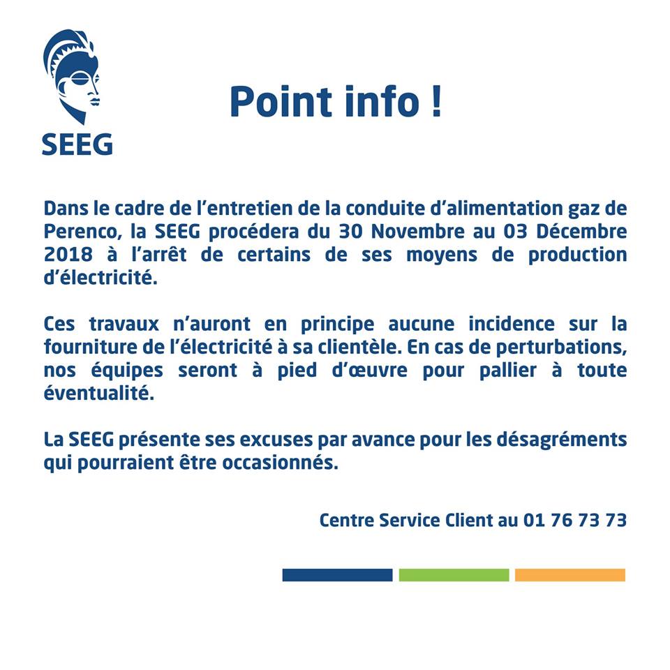 Dans le cadre de l’entretien de la conduite d’alimentation de gaz de Pérenco, la Société d’Energie et d’Eau du Gabon (SEEG) procédera du 30 Novembre au O3 décembre 2018, à l’arrêt de certains de ses moyens de production d’électricité. Ces travaux n’auront en principe aucune incidence sur la fourniture d’électricité à la clientèle. En cas de perturbations, les équipes seront à pied d’œuvre pour pallier à toute éventualité. La SEEG présente ses accuses par avance pour les désagréments qui pourraient être occasionnés MENGUE]]>