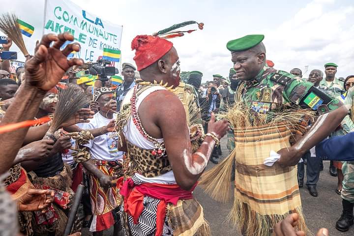 En effet, c’est au cours d’un mini rite traditionnel que les anciens et notables de la ville de Koulamoutou dans la province de l’Ogooué-Lolo, ont porté au Chef de l’État les symboles signifiant le pouvoir. Le Chef de l’État SE Brice Clotaire OLIGUI NGUEMA Président de la République Chef de l’État , Président de la Transition a reçu la bénédiction et la protection des ancêtres et génies.Ceci pour évidemment le benir afin d’achever la Transition dans les bonnes conditions, mener à bien l’œuvre de restauration que le CTRI a initié et surtout accentuer le développement durable des communautés de l’intérieur du pays hormis Libreville, qui n’est pas à elle seule le Gabon. Brice Clotaire Oligui Nguema n’a pas caché sa gratitude envers les notables et dignitaires de l’Ogooué-Lolo.