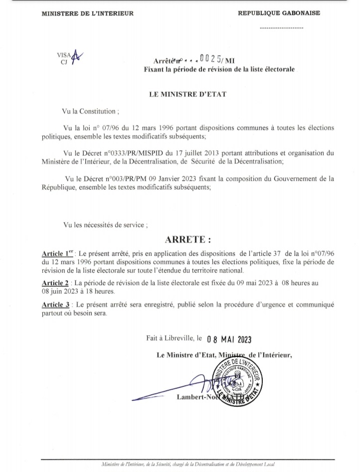 Conformément aux très hautes instructions des autorités du pays, et selon l’adoption récente du projet de loi sur la révision de la liste électorale, le ministère de l’intérieur a fait paraître un communiqué qui fixe du 09 Mai au 08 juin 2023 la période de la révision électorale.