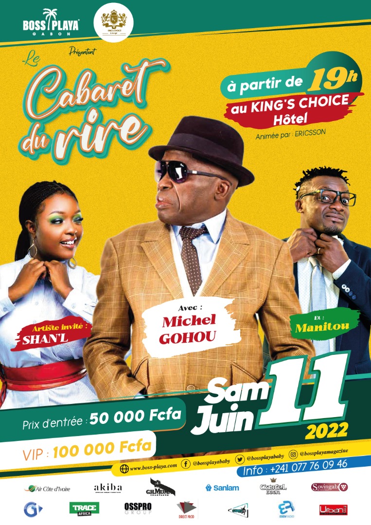 En effet, à l’occasion du Cabaret du rire qui se tiendra à Libreville le samedi 11 juin, Gohou Michel apparaît en tête d’affiche, à ses côtés Shan’l la kinda et Manitou l’humoriste, dans un spectacle qui promet déjà en humour, en danse et en chant, au King’s Choice Hôtel à partir de 19 heures. Les billets vendus de 50 000 à 100 000 francs CFA le VIP, sont d’ores et déjà disponibles aux différents points de vente choisis pour la circonstance. Nul doute que les librevillois et librevilloises répondront présents de crainte que l’honorable vice-président Gohou Michel ne nous »engage » des soufflets.