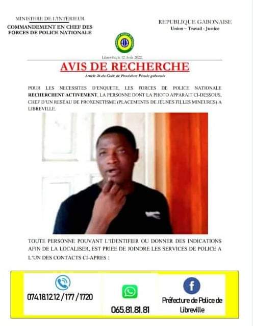 LES FORCES DE POLICE NATIONALE RECHERCHENT ACTIVEMENT, LA PERSONNE DONT LA PHOTO APPARAIT CI-DESSOUS, CHEF D’UN RESEAU DE PROXENETISME (PLACEMENTS DE JEUNES FILLES MINEURES) A LIBREVILLE