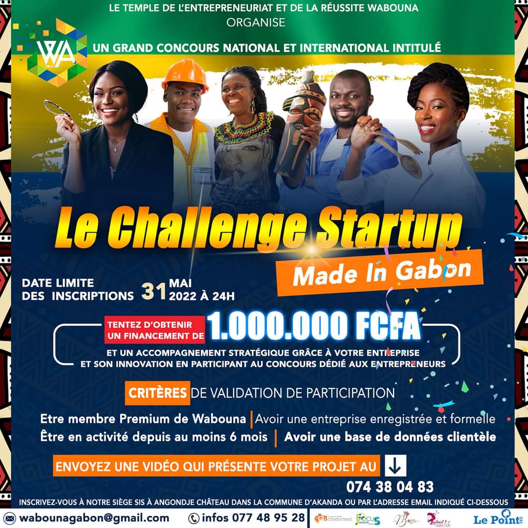 Wabouna le Temple de l’Entrepreneuriat et de la Réussite a lancé depuis le 01er Mai 2022, un Grand Concours National dénommé le Challenge Start-up « Made in Gabon ». Il s’agit d’une occasion extraordinaire pour les entrepreneurs de notre pays de tenter de gagner la bagatelle somme d’un (1) million de francs CFA pour Booster le développement et la notoriété de leur entreprise.