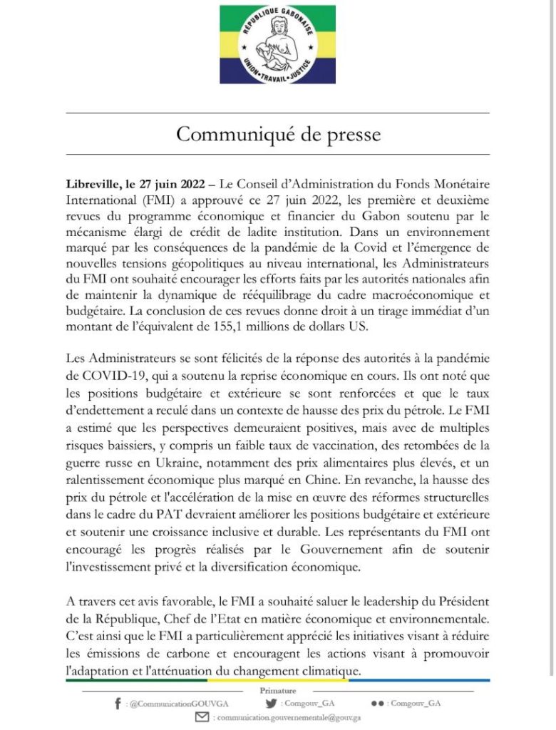 Le 27 juin 2022, le Conseil d’administration du Fonds monétaire international a achevé les première et deuxième revues de l’accord élargi appuyé par le mécanisme élargi de crédit (MEDC) pour le Gabon. L’achèvement des revues permet un décaissement de 116,1 millions de DTS (155.29 millions de dollars américain), portant le décaissement total à 197,1 millions de DTS (environ 263.63 millions de dollars américain) dans le cadre de l’accord triennal au titre du MEDC conclu avec le Gabon. L’accord élargi au titre du MEDC a été approuvé par le Conseil d’administration du FMI le 28 juillet 2021 pour permettre au Gabon de faire face aux conséquences économiques de la pandémie de la COVID-19 et de soutenir le programme de réformes économiques et financières des autorités (voir communiqué de presse n° 21/233 ).