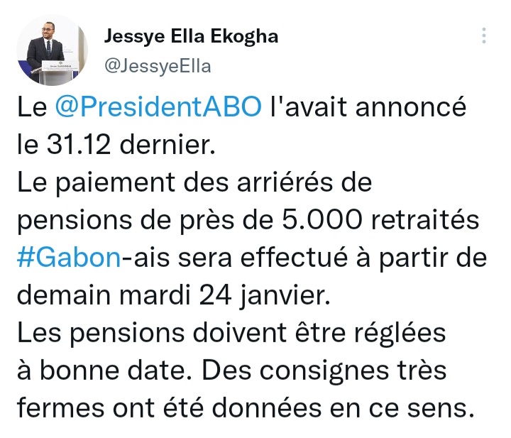 Pour rappel, Ali Bongo Ondimba avait indiqué, » En matière sociale, en plus des 1.000 nouveaux retraités déjà intégrés en novembre dernier dans nos fichiers, 5.000 supplémentaires le seront en 2023. Les arriérés de pensions de retraite seront intégralement réglés dès ce mois de janvier ».Sur son compte Twitter, le porte-parole de la Présidence de la République et Conseiller spécial du Chef de l’État, Jessye Ella Ekogha, indique que, « Le paiement des arriérés de pensions de près de 5.000 retraités Gabonais sera effectué à partir de demain mardi 24 janvier. Les pensions doivent être réglées à bonne date. Des consignes très fermes ont été données en ce sens ».