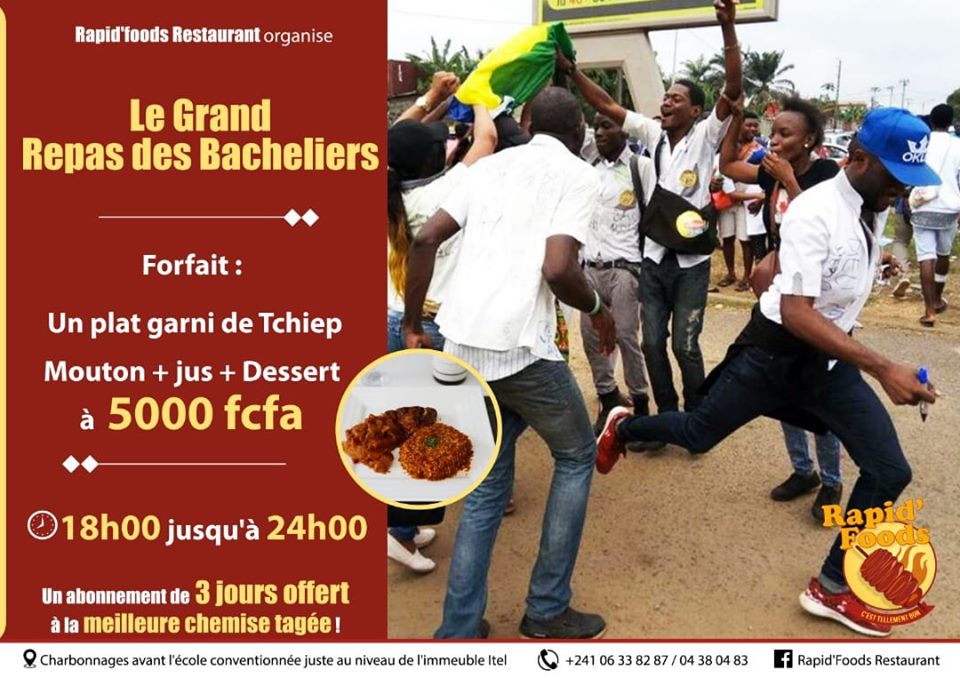 Le vendredi 26 au samedi 27 juillet 2019, le restaurant Rapid’foods situé aux charbonnages (avant l’école conventionnée, non loin de l’immeuble Itel), organise « le grand repas des bacheliers » . A cet effet, tous les bacheliers du Gabon sont conviés à venir faire la fête.