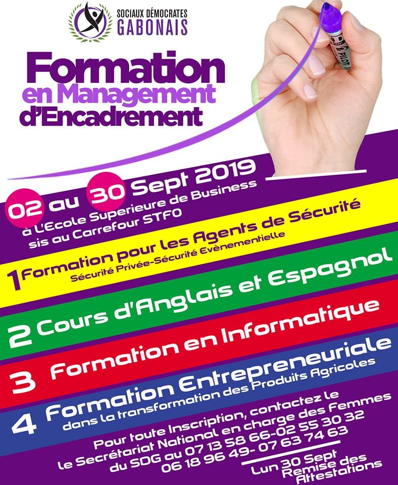 Le Parti les Sociaux Démocrates Gabonais (SDG), organise des formations professionnelles à Libreville du 02 au 30 septembre 2019. Cette initiative va permettre aux individus d’acquérir les capacités et les aptitudes nécessaires à l’exercice d’un métier ou d’une activité professionnelle.
