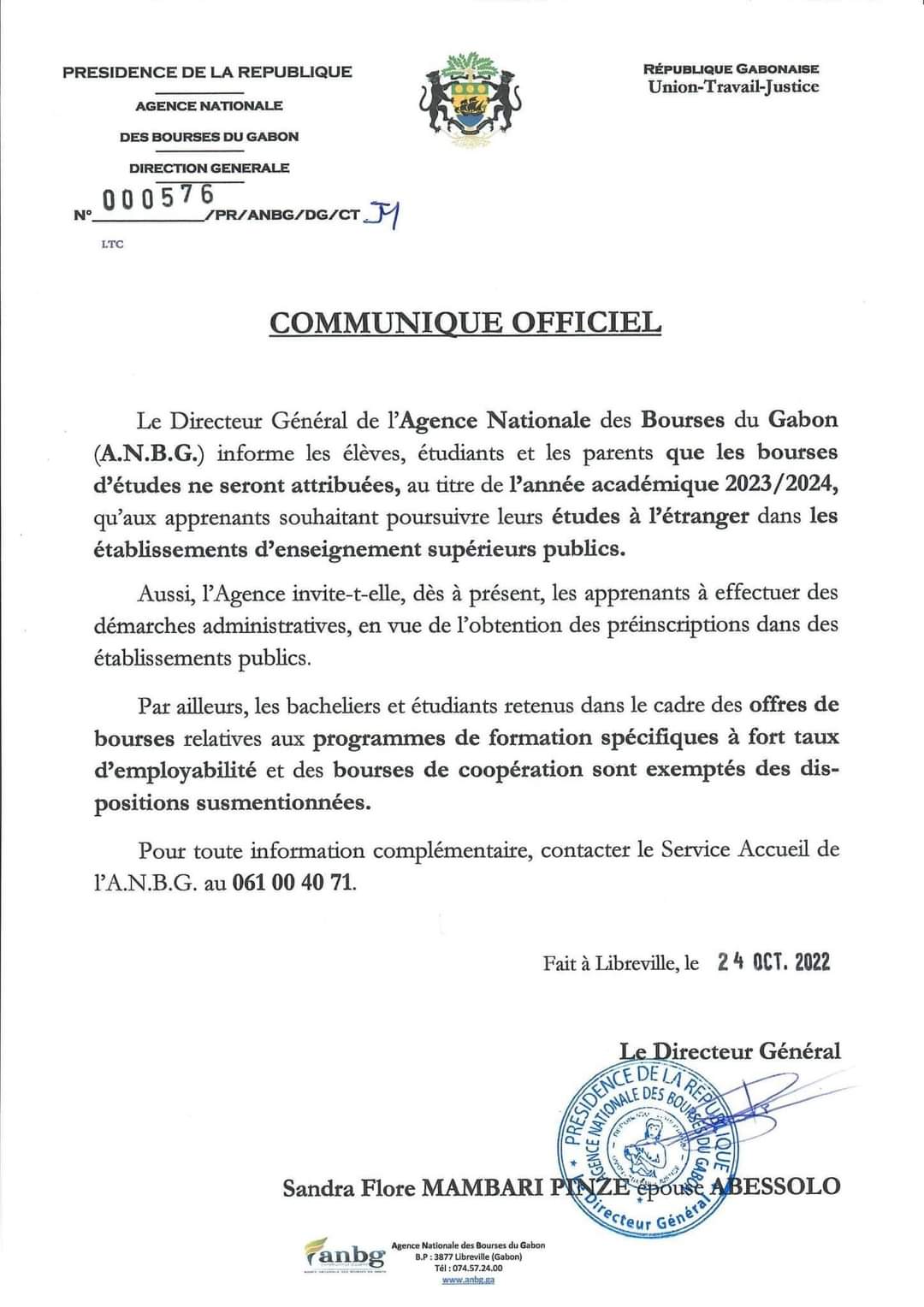 Dans un communiqué officiel émanant de l’Agence nationale des bourses du Gabon (ANBG), la direction générale informe et précise les choses en ce qui concerne l’année académique 2023/2024 pour les étudiants gabonais qui souhaitent aller étudier à l’étranger.