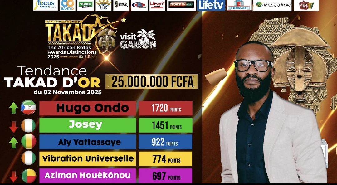 La course pour le prestigieux TAKAD D’OR des African Kotas Awards 2025 s’intensifie et connaît un rebondissement spectaculaire. Les tendances de ce 2 novembre révèlent un changement de leader inattendu, avec l’artiste Hugo Ondo de la Guinée Équatoriale qui s’empare de la première place, devançant la star ivoirienne Josey.