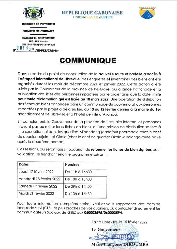 SOCIÉTÉ Liste définitivement Gsez Airport Route de contournement PDF par Focus Groupe media 16 février 2022 16 février 2022 801 clikez ici pour téléchager le fichier pdf Clikez ici pour télécharger le fichier PDF PartagerCommentaires 0 commentaires Email Focus Groupe media article précédent Portrait de Ismaël Oceni Ossa, Président du Président du Conseil Supérieur des Affaires Islamique du Gabon article suivant Port-gentil : formation gratuite de 30 jeunes aux métiers du numérique Articles similaires Solidarité nationale : le Président de la République... 12 décembre 2025 Taxe forfaitaire d’habitation au Gabon: les parlementaires invités... 12 décembre 2025 Gabon: Conflit de Compétences persistant entre le Ministère... 12 décembre 2025 Reprise du paiement de plusieurs prestations sociales: Oligui... 11 décembre 2025 Oligui Nguema: «C’est avec une profonde douleur que... 10 décembre 2025 Rétablissement des Prestations Sociales au Gabon : une... 10 décembre 2025 Stage « Expérimenté » : le paradoxe salarié qui s’ancre... 10 décembre 2025 Gabon : le SAMU social distribue 10,4 milliards... 10 décembre 2025 Danger en Mer : «un corps mort non... 9 décembre 2025 La SNI et le CGC renforcent leur partenariat... 9 décembre 2025
