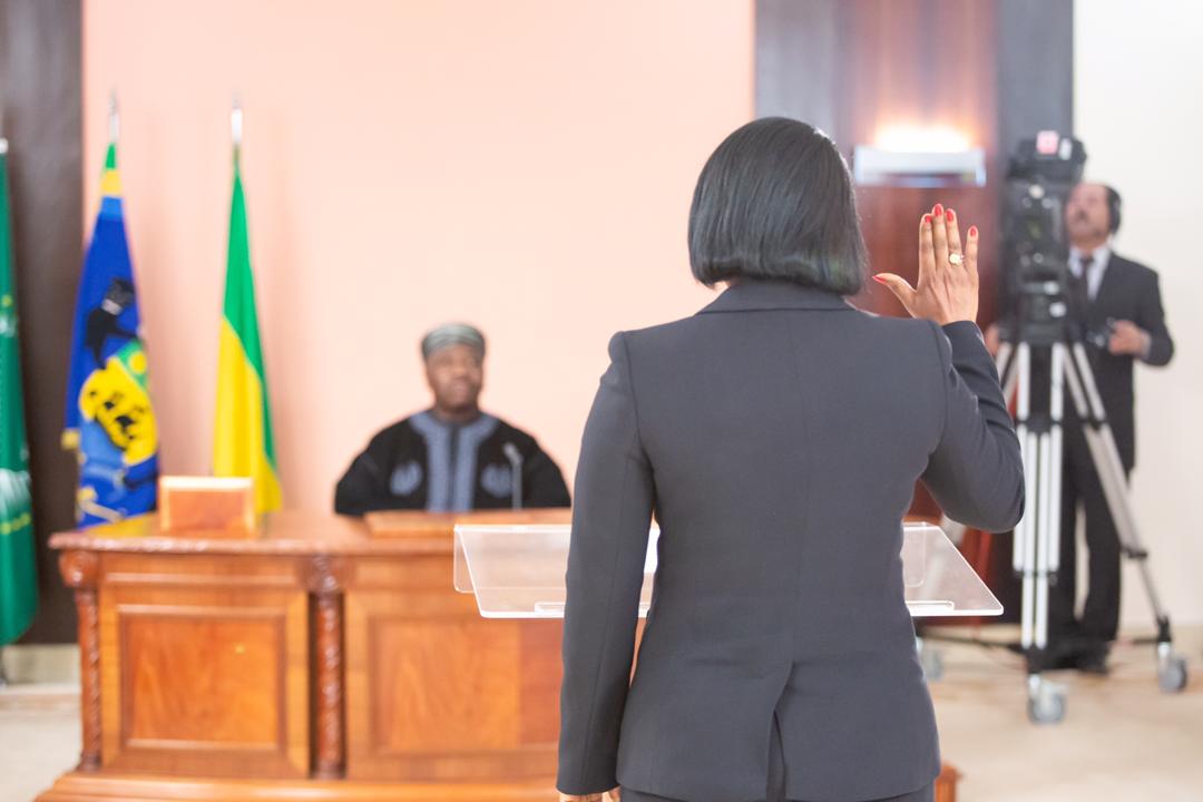 C’est en présence des conseillers membres de la Cour Constitutionnelle que le président de la République, Ali Bongo a reçu ce mardi à Rabat, le serment de Rose Christiane Ossouka promu au gouvernement en qualité de ministre de la défense. La cérémonie de prestation de serment a eu lieu à l’ambassade du Gabon au royaume chérifien où le président de la République poursuit sa convalescence. A travers les images officielles de cette cérémonie, on voit un Ali Bongo un peu plus en forme et accompagné de ses proches collaborateurs, dont son Directeur de cabinet Brice Laccruche Alihanga. C’est la première réapparition publique du président de la république, après son retour à Rabat en début d’année, juste après avoir reçu le serment du nouveau gouvernement de la république à Libreville. CNA]]>
