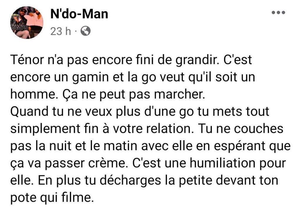 »Ténor n’a pas encore fini de grandir. C’est encore un gamin et la go veut qu’il soit un homme. Ça ne peut pas marcher. Quand tu ne veux plus d’une go tu mets tout simplement fin à votre relation. Tu ne couches pas la nuit et le matin avec elle en espérant que ça va passer crème. C’est une humiliation pour elle. En plus tu décharges la petite devant ton pote qui filme.