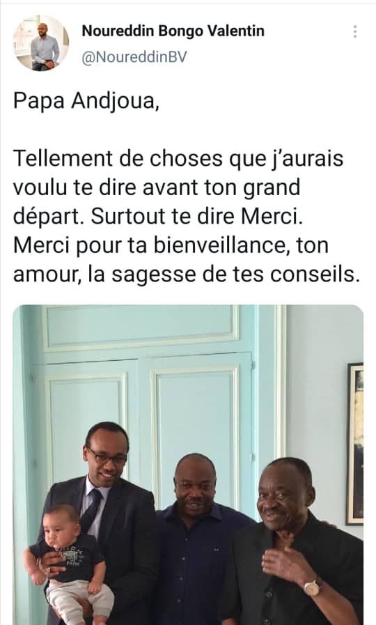 Sur son compte tweeter, Noureddin Bongo Valentin a regretté le départ brusque de son regretté grand-père « papa Andjoua ». « Tellement de choses que j’aurais voulu te dire avant ton grand départ. Surtout te dire Merci. Merci pour ta bienveillance, ton amour, la sagesse de tes conseils. », par ces mots, c’est un immense chagrin que le coordinateur général des affaires présidentielles laisse transparaître.