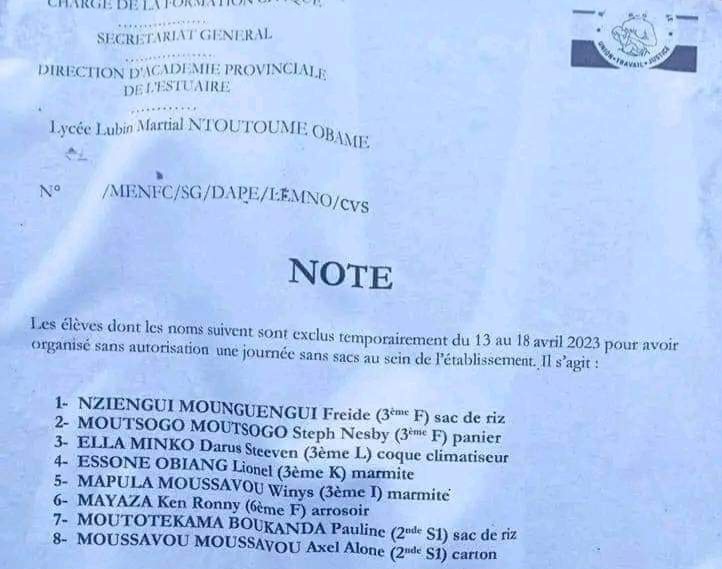 En effet, les responsables du Lycée Lubin Martial ont tenu un conseil de classes à l’issue duquel 8 élèves ont été exclus temporairement. » Les élèves dont les noms suivent sont exclus temporairement du 13 au 18 avril pour organisé une journée sans sac au sein de l’établissement, il s’agit de:- NZIENGUI Mounguengui (3ème, sac de riz);- Moutsogo Steph (3ème, panier);-Ella Minko (3ème, coque climatiseur);-Essone Obiang ( 3ème, marmite); – Mapula Moussavou (3ème, marmite);-Mayaza Ken (6ème, arrosoir);- Boukanda Pauline (2nde , sac de riz);- Moussavou Moussavou ( 2nde, carton).