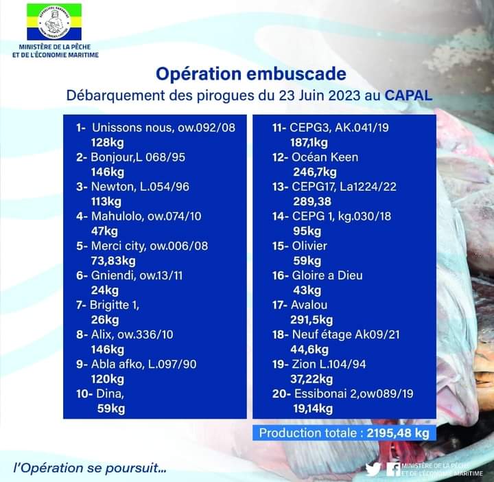 Accueil SOCIÉTÉPêche : l’opération embuscade a permis la saisie de 2195,48 kg de poissons destinés à la vente illicite au CAPA de Port-gentil