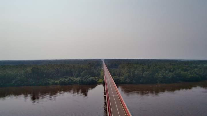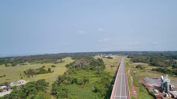 Ce splendide pont qui est un véritable billard en matière de réalisation de bitumage, est considéré comme le 3ème pont le plus long d’Afrique. »Long de 4,707 km, ce pont fait partie des deux ouvrages d’art de l’infrastructure globale (Ozouri et Nkomi), avec le pont sur la lagune Nkomi, long de 4,577 km. L’ouvrage comportant le pont d’Ozouri porte sur la construction d’une nouvelle route de 93 km, partant de Mbega, à 22 km au Sud de Port-Gentil et longeant la côte Atlantique pour atteindre Omboué.La construction de cet édifice qui figure comme le pont le plus long de la sous-région a mobilisé près de 850 agents dont 500 gabonais.