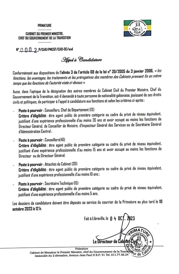 Dans l’optique de renouveler son cabinet civil, le Premier ministre, chef du gouvernement de la Transition, Raymond Ndong Sima, a lancé un appel à candidature ce 04 octobre 2023. À cet effet, il invite 88 gabonais jouissant de leurs droits civils et politiques à postuler.Le Gabon s’engage encore un peu plus dans le sens de la fin des privilèges.