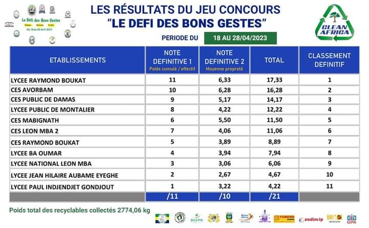 L’objectif de ce concours » le défi des bons gestes » était de favoriser l’assainissement et la propreté des établissements. À l’issue de celui-ci et selon les résultats enregistrés, le Lycée Rayamond Boukat, les CES Avorbam et Damas occupent respectivement la première, deuxième et troisième places avec des moyennes de 17,33; 16, 28 et 14,17 sur 20. Mais c’est également un challenge qui a permis de constater selon les résultats, que les grands établissements publics de la capitale gabonaise ont énormément de mal à assurer en matière de propreté.