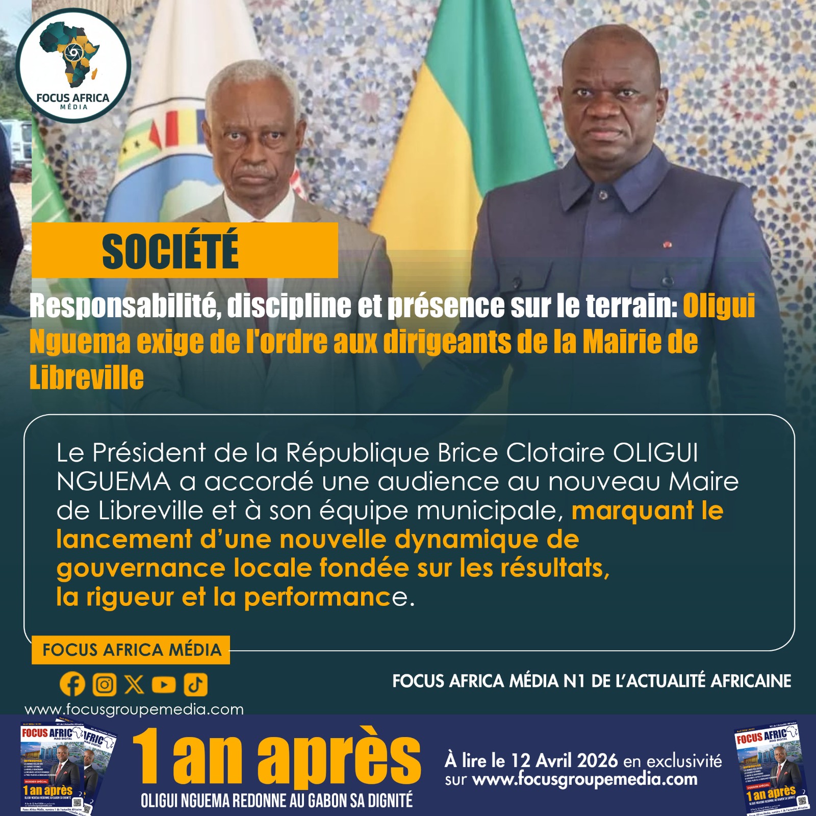 Le Président de la République Brice Clotaire OLIGUI NGUEMA a accordé une audience au nouveau Maire de Libreville et à son équipe municipale, marquant le lancement d’une nouvelle dynamique de gouvernance locale fondée sur les résultats, la rigueur et la performance.A cette occasion, le Chef de l’Etat a fixé un cap clair à travers une feuille de route structurée, axée sur des priorités immédiates à savoir l’assainissement de la capitale, le renforcement de la collecte des déchets, la lutte contre les dépôts anarchiques et l’amélioration durable du cadre de vie des populations.