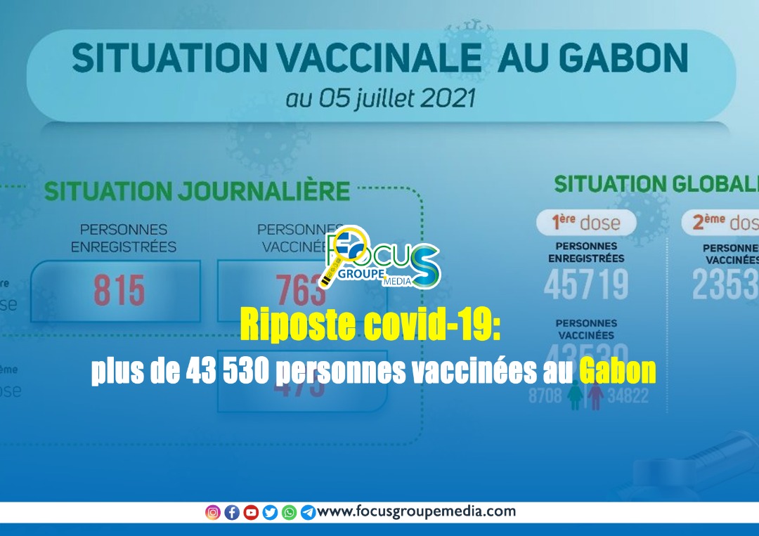 Dans le cadre du programme national de vaccination, 24 centres sont ouverts dans les provinces de l’Estuaire, de l’Ogooué-maritime, du Haut-Ogooué, de l’Ogooué-Lolo, de la Nyanga, de la Ngounié, du MoyenOgooué, de l’Ogooué-Ivindo et du Woleu-Ntem. Selon les derniers chiffres du plan national de la vaccination, il y a eu 1238 vaccinés de plus le 5 juillet 2021, parmi lesquels 475 ont reçu la 2ème dose et 763 la 1ère dose.