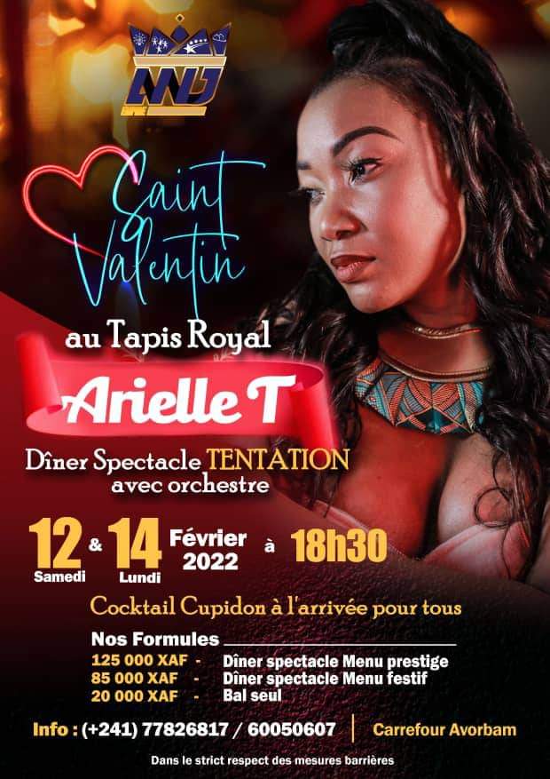 La star gabonaise Arielle-T alias » la go d’à côté » sera en prestation Live les 12 et 14 février 2022 à partir de 18h30 au cours de deux diners spectacles avec orchestre à l’occasion de la Saint Valentin au » Tapis Royal » dans l’enceinte de ANJ EMPIRE situé au carrefour Avorbam.