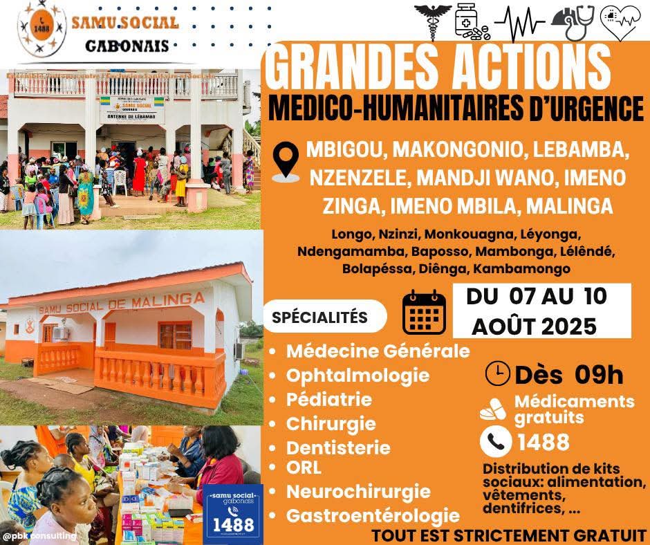 Du 7 au 10 août 2025, le SAMU Social Gabonais organise une série de grandes actions médico-humanitaires d’urgence dans plusieurs localités du pays. L’objectif est de fournir des soins de santé essentiels et une assistance humanitaire aux populations dans le besoin.