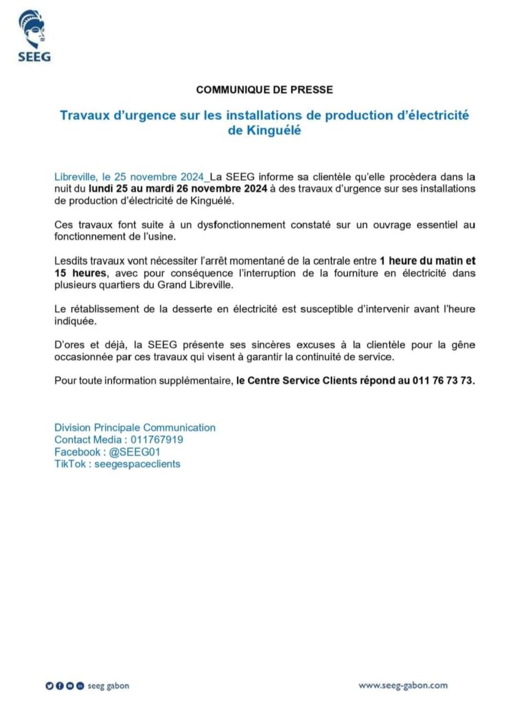 SOCIÉTÉ SEEG : vers une journée entière sans électricité dans plusieurs quartiers du Grand Libreville par Focus Groupe media 26 novembre 2024 26 novembre 2024 817 C’est par le biais d’un communiqué rendu public ce lundi 25 novembre, que la société d’énergie et d’eau du Gabon a informé les populations du Grand-Libreville des travaux d’électricité qu’elle mènera ce jour. Ci-joint, le communiqué de presse : PartagerCommentaires ÉlectricitéenergieGabonGrand-LibrevilleLibrevilleSEEGTravaux 0 commentaires Email Focus Groupe media article précédent Livraison d’un important lot de matériel roulant à l’État gabonais : éviter à tout prix de répéter les erreurs du passé article suivant Bord de mer de Libreville : une buse menace dangereusement de s’effondrer confrontée à l’érosion de la route Articles similaires Propreté Urbaine : le Gouvernement valide un Partenariat... 5 décembre 2025 Recensement Accablant : Sur 2 049 Bâtiments publics... 5 décembre 2025 Haut-Ogooué : la réhabilitation de l’axe stratégique Moanda–Bakoumba... 4 décembre 2025 Pk12 : bientôt la Construction d’un Flyover sous... 4 décembre 2025 Haut-Ogooué : l’axe Aéroport de Mvengue–Franceville se modernise... 4 décembre 2025 Le SAMU Social Gabonais lance un appel déchirant... 3 décembre 2025 Sébé- Brikolo: le Maire d’Okondja, Claude Ella Nziet,... 3 décembre 2025 Hommage National: le Président Oligui Nguema Salue la... 3 décembre 2025 Les Machines entrent en action : la Route... 2 décembre 2025 Franceville : la région minière du Haut-Ogooué et... 1 décembre 2025
